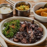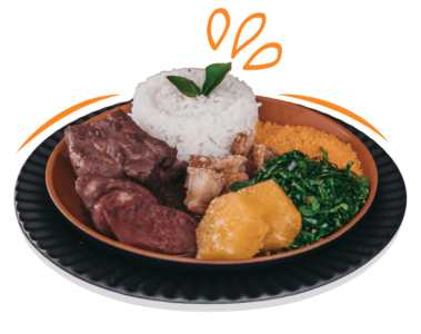 O Kit Feijoada é uma opção deliciosa e completa para duas pessoas, composto por arroz, feijoada, couve, laranja e farofa.
